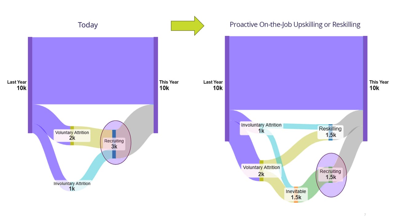 I’ve written about it in this article about on-the-job upskilling. I use this Sankey diagram to illustrate how upskilling and reskilling can help retain your current frontline workforce.